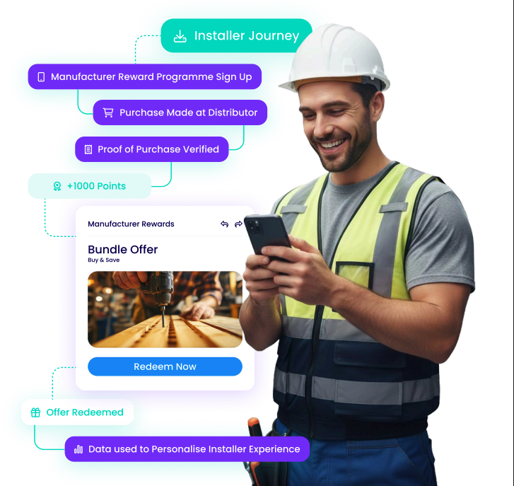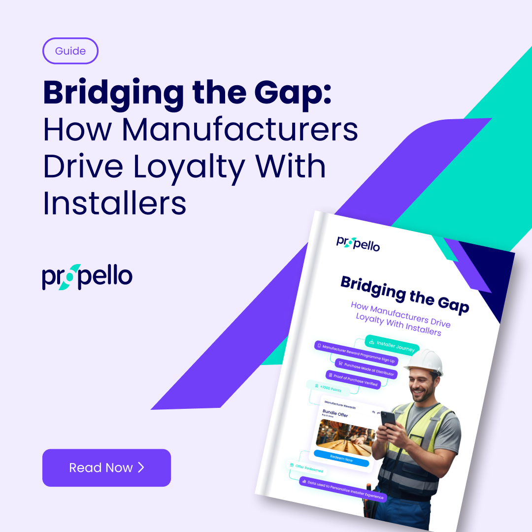 Manufacturers sell through distribution, but trade customers influence what gets chosen and used. Propello connects loyalty activity to verified purchases and installs across non-owned channels, then rewards the behaviours that drive pull-through. This lets you run trade customer, distributor/branch, and internal sales incentives in one programme, without changing how products are bought through the channel.