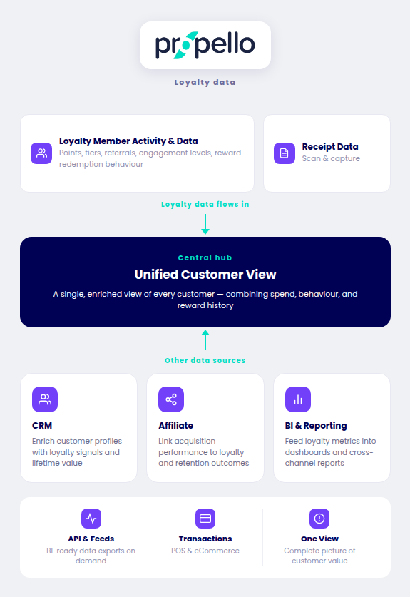Bring loyalty insights together with the systems you already rely on. Connect Propello data to CRM, affiliate platforms, and reporting tools to build a complete view of customer value and performance across channels.